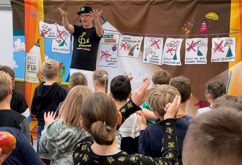 Mitte November erlebten die Kinder aller Klassenstufen ein Konzert mit dem Kinderliedermacher Dirk Preusse aus Leipzig. Das Thema „Miteinander – Füreinander“ wurde auf unterhaltsame Weise unter Einbindung von Musik und Bewegung den Mädchen und Jungen nahegebracht. Im Mittelpunkt standen der respektvolle und freundliche Umgang miteinander sowie das Vermitteln von Regeln. Nicht nur als Zuschauer dabei zu sein, sondern auch am Platz oder auf der kleinen Bühne aktiv mitzumachen, ließ die Zeit wie im Flug vergehen. Wir wünschen Herrn Preusse weiterhin viele schöne Konzerte und freuen uns auf ein Wiedersehen.